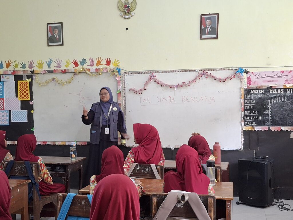 Mahasiswi KKN UNS 2026 Kelompok 68 sedang menjelaskan mengenai mitigasi bencana