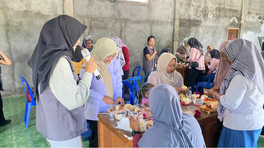 Kegiatan kemudian dilanjutkan dengan praktik langsung mengolah hidangan sehat berbahan buah segar. Peserta tampak antusias mencoba setiap tahapan, sekaligus berdiskusi mengenai kandungan nutrisi, manfaat serat, dan cara penyajian makanan sehat agar lebih menarik bagi anak.